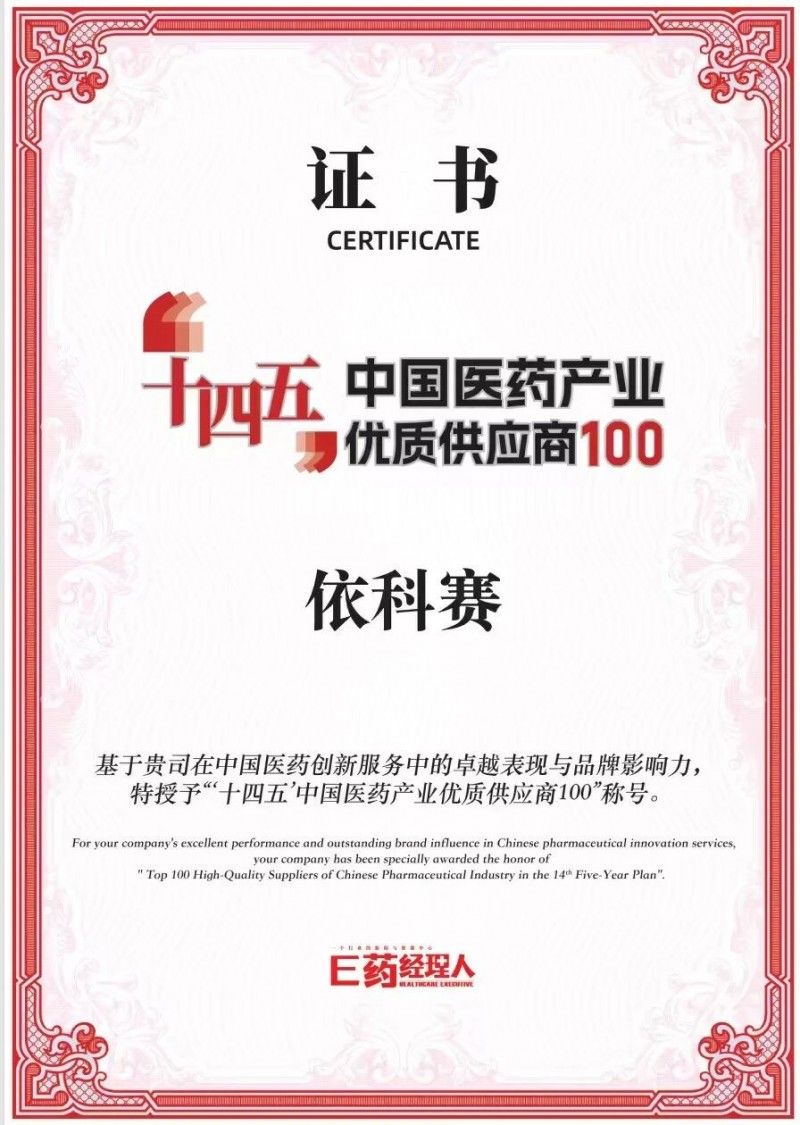 依科賽生物的入選,彰顯了我司在中國醫藥創新服務中的卓越表現與品牌影響力。