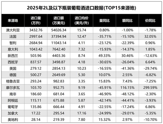 2025年全年,澳大利亞2L及以下的瓶裝靜止葡萄酒進口量達到3432.76萬升,進口額達到5.4億美元(約合人民幣34.61億元),進口升均價為15.74美元(約合人民幣109.63元)。
