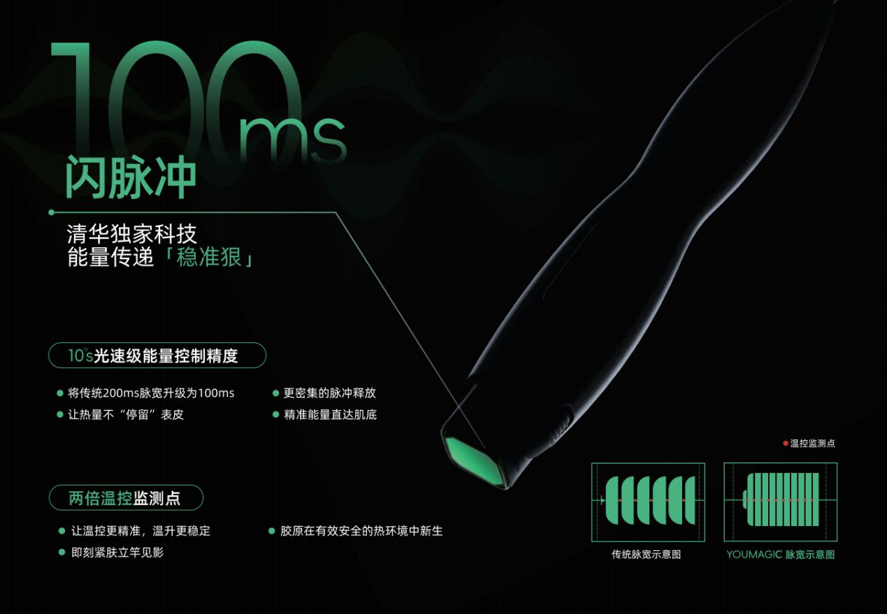 直面傳統射頻技術長期存在的“能量不穩定、熱感均勻性不佳、精準性不足”等瓶頸,YOUMAGIC舒立緹依托清華大學工程物理系數十年的能量源技術積淀,實現了技術突破。產品具備獨創的100ms閃脈沖技術,通過增加溫度監測點,讓溫控更精準,溫升更穩定,減少冷熱交替引起的疼痛,大幅提升治療舒適性;通過更密集的脈沖釋放,可讓能量快速精準注入,降低對神經的刺激,并減少熱累積,讓治療“高能不高痛”。多維智能溫控技術則確保表皮溫度在合理區間,避免燙傷等安全風險,再結合動態脈沖技術、四檔制冷可調功能與能量密度可視化系統等技術,可因膚定制治療方案,拓寬用戶的選擇邊界,整體實現“高能、舒適、有效”三重升級,全面革新治療體驗。
