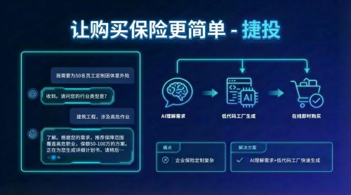 傳統保險產品定制流程復雜、周期長,難以滿足用戶高度個性化的風險需求,為此保準牛通過融合生成式AI與低代碼產品工廠能力,推出捷投·智能保險定制引擎。