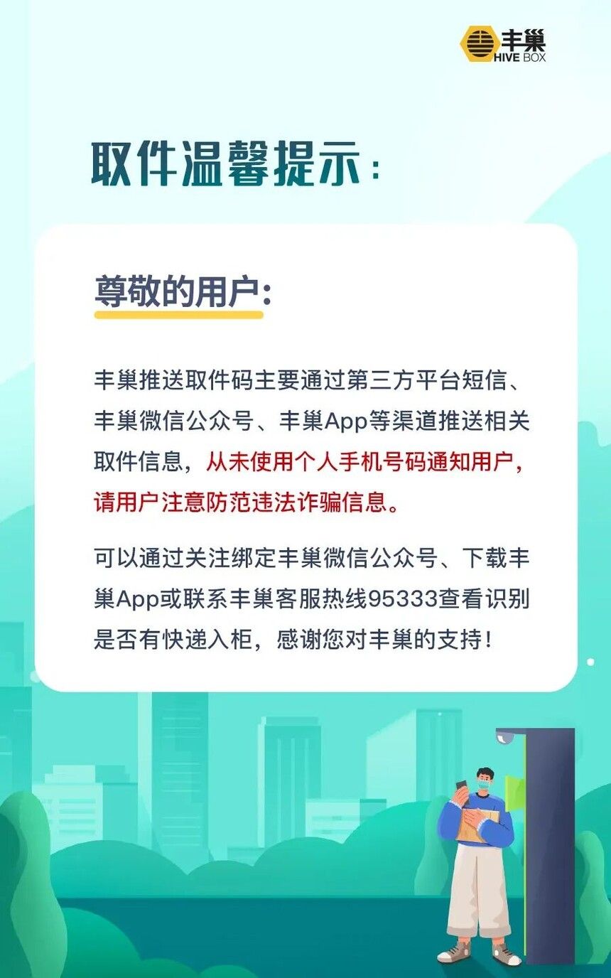 豐巢鄭重聲明,公司所有取件通知均通過第三方平臺短信、豐巢微信公眾號、豐巢app等相關渠道推送,從未使用個人手機號碼單獨發送取件短信或撥打電話:
