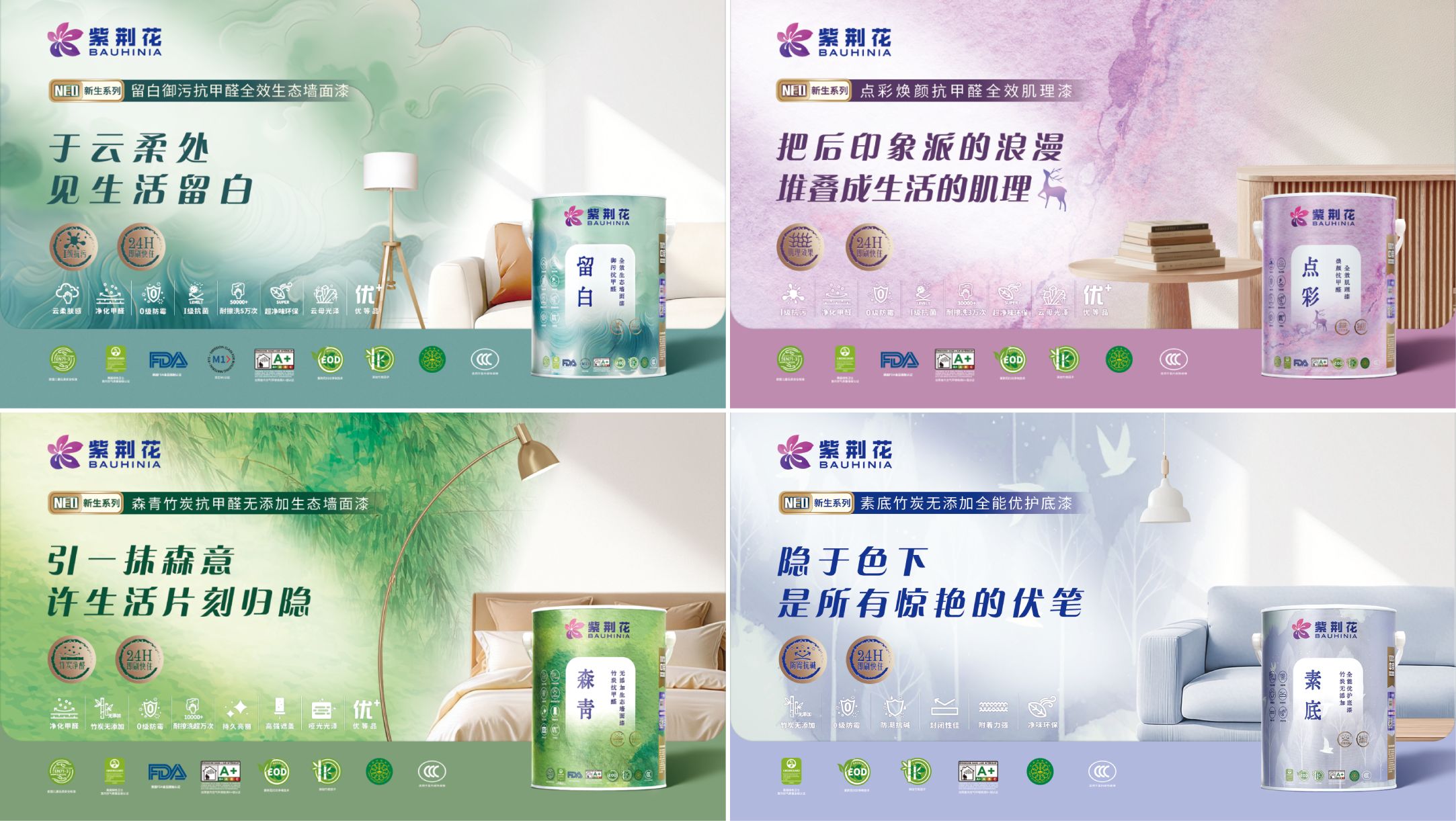 - 零售渠道:推出紫荊花NEO新生系列乳膠漆新品,包含“留白、點彩、森青、素底”四款兼具東西方美學與性能的產品。NEO新生系列寓意新生,堅守唯一初心,彰顯紫荊花立足行業標桿的魄力。新產品定位和包裝設計已輕盈跨越東西方美學疆界,兼具東方的寫意與雅致,與西方的現代與格調巧妙相融,精準呼應了年輕人群對理想生活的本能向往。