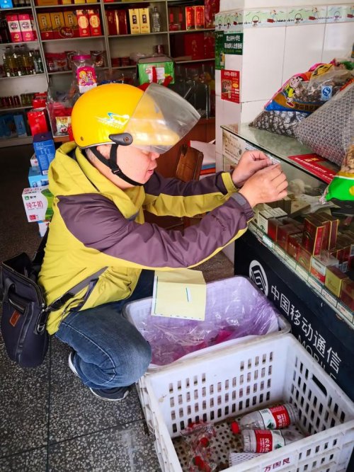 (圖為客戶經理在零售戶店內張貼法律法規宣傳海報)
