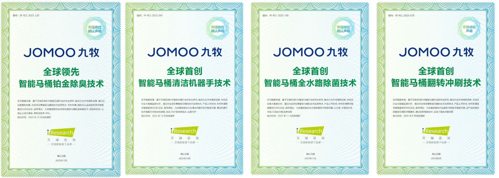 市場份額的領先,源于底層技術的突破。據艾瑞咨詢發布的系列技術認證報告顯示,九牧通過研發四項“全球首創”或“世界領先”的核心技術,系統性解決了智能馬桶行業的關鍵痛點,為其“第一品牌”的地位提供了堅實的技術支撐: