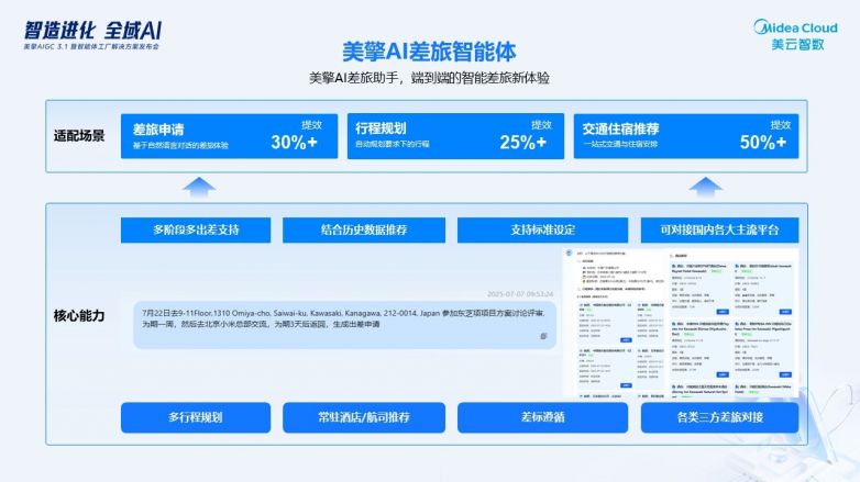 美擎AI差旅智能體:輸入“客戶拜訪”“展會參展”等需求,自動生成差旅方案并自動匹配預算,審批流程大大縮短;