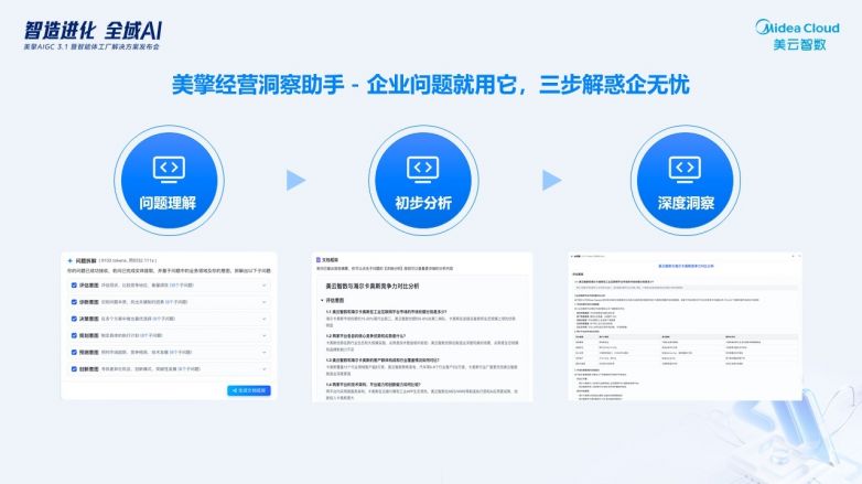 美擎經營洞察助手:用“數據看板+知識圖譜”拆解經營問題,3步生成可落地的提效建議(如“庫存周轉率提升15%”)。