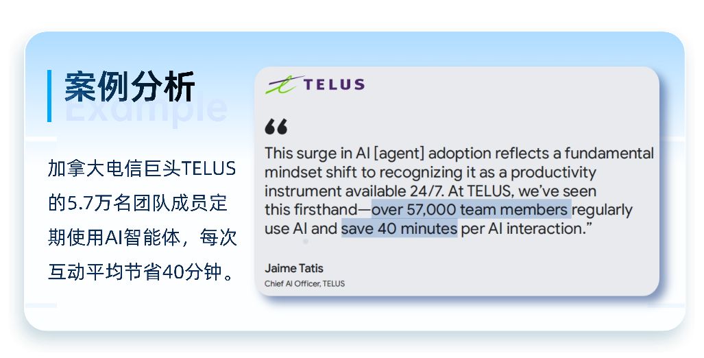 加拿大電信巨頭TELUS的5.7萬名團隊成員定期使用AI智能體,每次互動平均節省40分鐘,印證了智能體作為“全天候生產力工具”的核心價值。