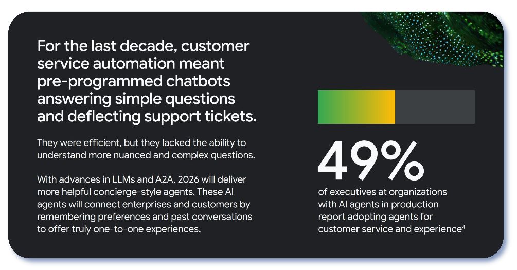 過去十年,客戶服務自動化的核心是預編程聊天機器人。它們高效但僵化,無法應對復雜、細微的客戶需求。2026年,LLM與A2A協議的進步將催生“禮賓式智能體”,以個性化、主動化的服務重塑客戶體驗。
