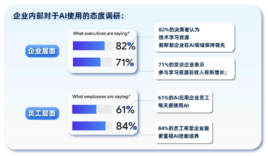 調研數據顯示,82%的決策者認為技術學習資源能幫助企業在AI領域保持領先,71%的受訪企業表示參與學習資源后收入有所增長;而員工層面,61%的AI應用企業員工每天使用AI,84%希望企業更重視AI技能培養。