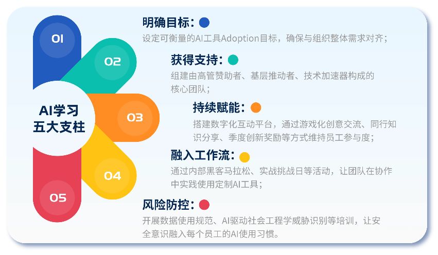報告還提出“AI學習五大支柱”,為企業構建AI就緒型workforce提供了行動框架: