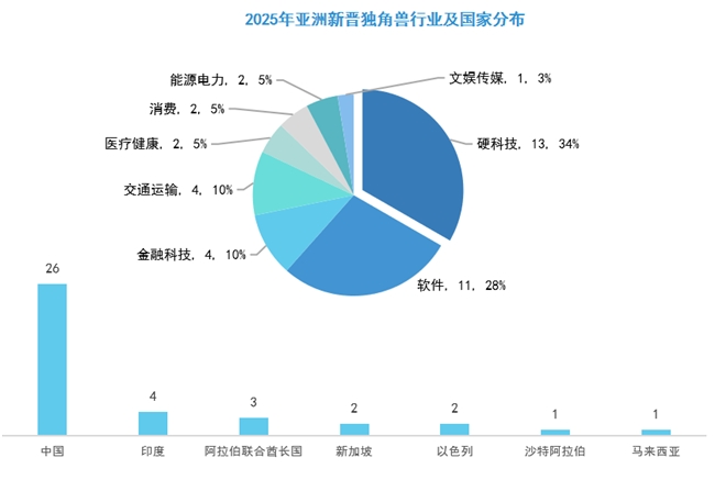 2025年,亞洲新晉39家獨角獸企業,總估值約為2207.71億美元,平均估值約為56.61億美元。其中硬科技(13家,34%)和軟件(11家,28%)行業居多,金融科技(4家,10%)以及交通運輸(4家,10%)行業其次,其余為醫療健康(2家,5%)、消費(2家,5%)等行業。