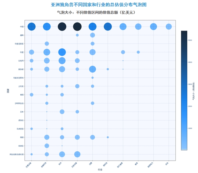 亞洲獨角獸論壇分析各國家對應行業的獨角獸估值后,發現:1)中國的軟件、文娛傳媒、交通運輸、硬科技、消費、金融科技6個行業總估值均超過1000億美元;印度僅軟件行業總估值超過1000億美元。2)除中國和印度外,以色列的軟件、阿拉伯聯合酋長國的文娛傳媒估值也相對較高。