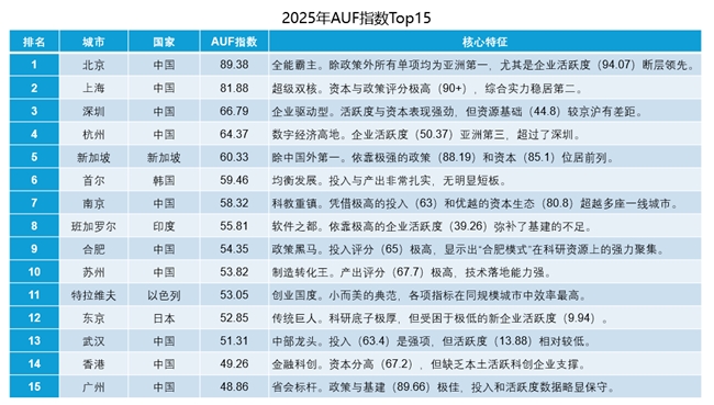 在AUF指數的版圖中,中國城市憑借龐大的體量占據了頭部位置,而亞洲其他國家的中心城市呈現出截然不同的“創新進化路徑”。