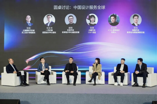 第一場圓桌的主題是“中國設計服務全球”,由上海國際汽車城天工設計學院院長張銘主持,紅旗造型設計中心部長劉玉書、長安汽車全球設計中心副總經理赫英、小鵬汽車CMF總監張琳、iCAR造型設計負責人張自然、嵐圖汽車數字化與智能網聯總監張侃參與討論。