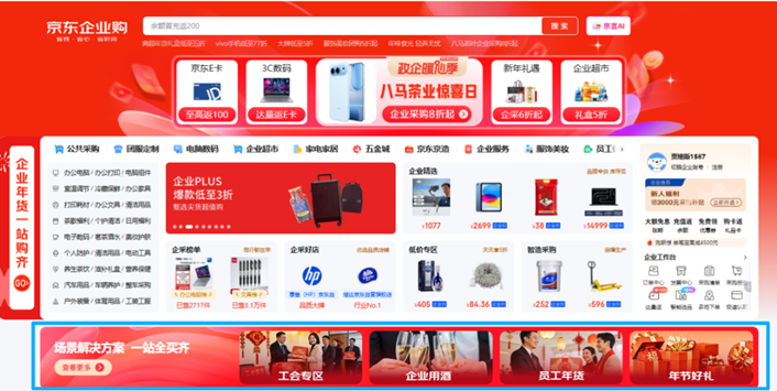 在政策引導與市場需求雙重驅動下,企業福利采購、年貨禮贈等需求集中釋放,京東企業購針對員工福利、商務禮贈等高頻場景,打造了年貨節場景解決方案,將京東平臺的標準化產品能力,轉化為“省心、高效、有溫度”場景化服務,匯聚成“年貨節采購工具包”,顯著降低企業數字化采購門檻,實現從單純“賣商品”到深度“賣服務”的轉型。
