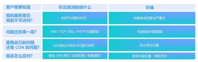 撥測不是替廠商“抓錯”,而是替客戶“還原事實”,當 CDN 或云服務宕機時,聽云 Network 的撥測體系可以幫企業在幾分鐘內回答這四個關鍵問題: