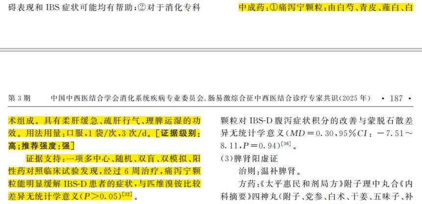 痛瀉寧顆粒是目前治療 IBS-D 循證最多、質量最高的中成藥,因其療效確切、安全性高、經濟性好等優勢顯著,先后獲10余項國際國內指南/共識推薦,且是中華醫學會《2020年中國腸易激綜合征專家共識意見》唯一推薦及《腸易激綜合征中西醫結合診療專家共識(2025年)》唯一高證據質量、強推薦的中成藥。