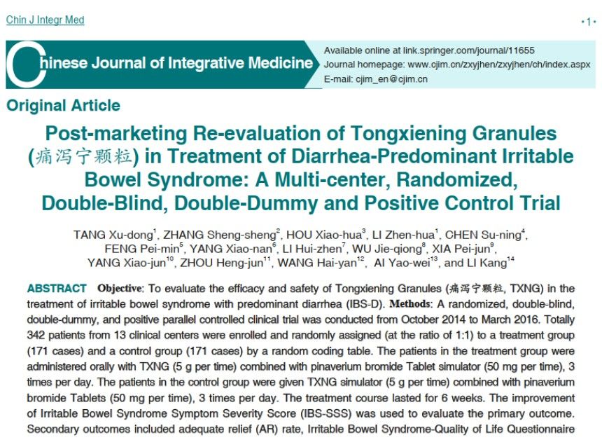 痛瀉寧顆粒已在臨床應用10余年,積累了大量的臨床研究數據與應用經驗。20余項高質量隨機對照(RCT)臨床研究顯示:痛瀉寧顆粒能多環節、多靶點有效改善IBS-D患者腹痛、腹瀉、腹脹、腹部不適等整體癥狀,且可明顯延長復發或加重的時間,有效降低復發率。一項痛瀉寧顆粒治療IBS-D與得舒特(匹維溴銨片)進行的342例的多中心、大樣本RCT臨床研究證明,痛瀉寧顆粒治療IBS-D整體療效與得舒特(匹維溴銨片,臨床一線陽性化藥)相當或更優,痛瀉寧顆粒起效更快,對重癥IBS-D和女性患者療效更好,復發率更低;該研究成果已在國際權威期刊《Chinese Journal of Integrative Medicine》(IF 2.9)發表。另一項納入480例患者的多中心RCT臨床研究也顯示,痛瀉寧顆粒治療IBS-D安全、有效,療效顯著優于安慰劑組,且用藥期間無明顯不良反應。