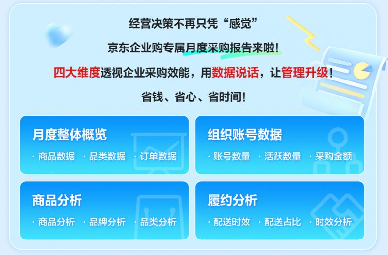 京東企業購依托大數據與AI技術,結合行業特性、預算及采購場景,為中小企業智能推送適配的年貨方案;同時,平臺通過采購管理后臺實現清單生成、訂單實時查詢,并推出專屬月度采購報告,從月度整體概覽、組織賬號數據、商品分析、履約分析四大維度,全面透視企業采購全鏈路數據,讓采購決策從“憑感覺”升級為“用數據說話”,助力企業實現高效、透明的采購管理。