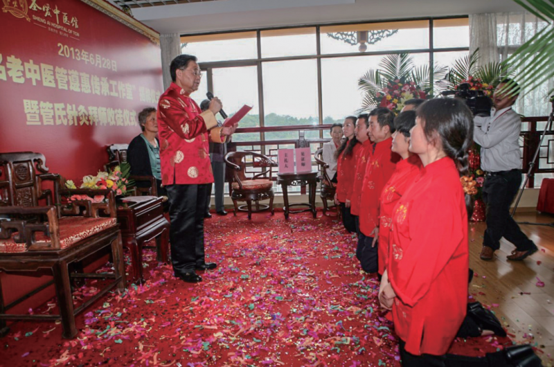 2013年6月28日,圣愛中醫館《管氏針灸醫學流派學術經驗師承班》管遵惠收徒15名拜師儀式