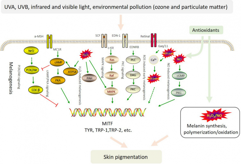 光療雖然能通過免疫調節、激活黑素細胞等機制促進復色,但其使用的紫外線在治療同時也會誘導皮膚產生活性氧(ROS)。當ROS積累過多,超過皮膚自身的清除能力時,便會加劇氧化應激反應。這一過程會直接損傷黑素細胞的DNA,抑制黑色素合成關鍵蛋白MITF的表達,甚至耗竭毛囊中的黑素干細胞儲備,導致黑素細胞修復能力下降。