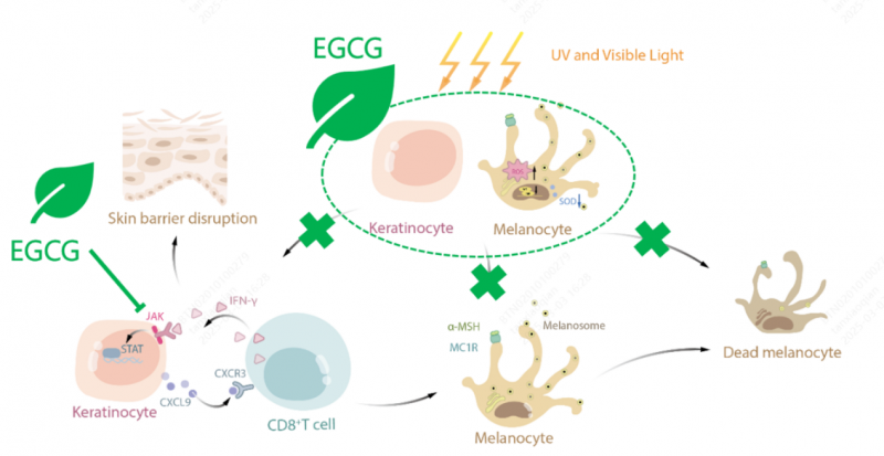凈衡凝膠的核心機制在于其多通路協同作用。在抗氧化方面,其富含的綠茶多酚能直接清除自由基,減輕光療及日常紫外線暴露引發的氧化應激,保護黑素細胞免受進一步損傷。在免疫調節方面,研究證實,綠茶多酚中的活性成分可抑制JAK2激酶的過度活化。JAK-STAT信號通路與白癜風發病密切相關,其過度激活會促使角質形成細胞釋放特定趨化因子,招募并激活攻擊黑素細胞的CD8+ T細胞。通過抑制該通路,凈衡凝膠有助于從免疫層面控制病情活動。