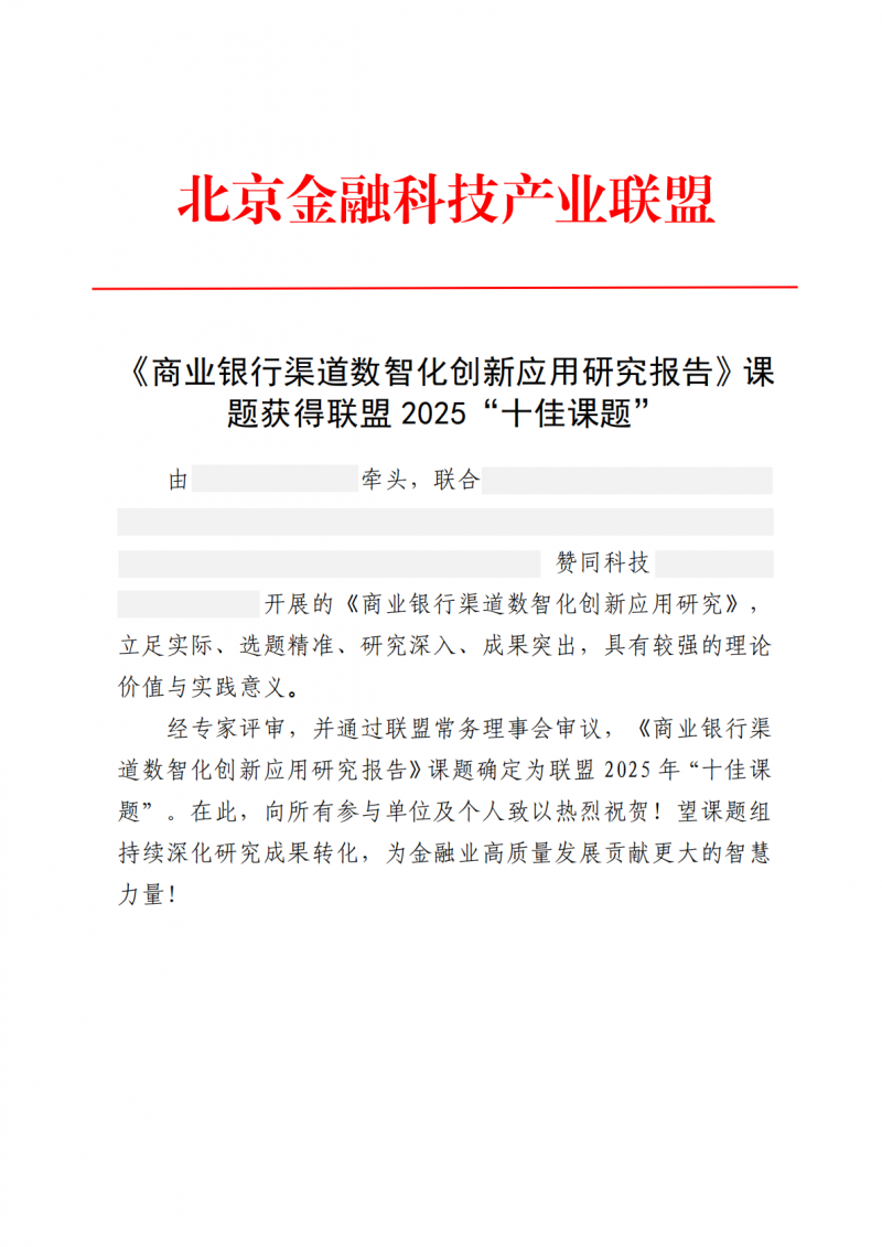 《商業銀行渠道數智化創新應用研究報告》獲得聯盟2025“十佳課題”