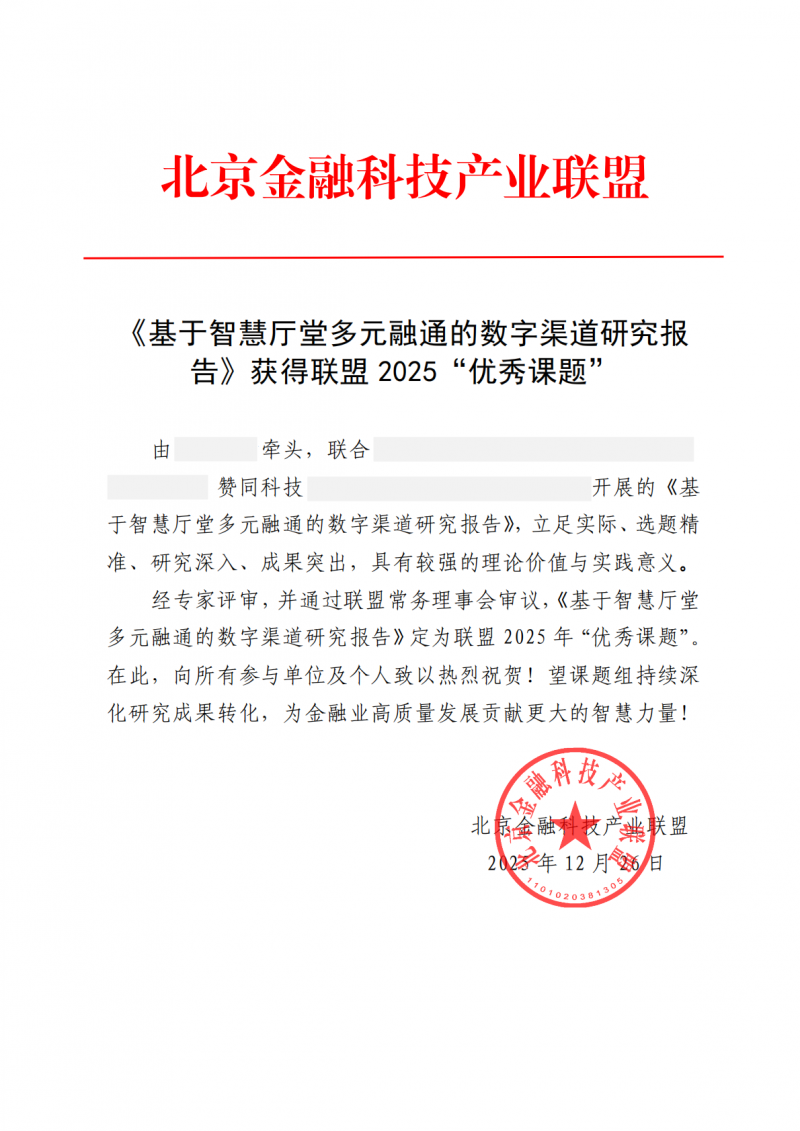 《基于智慧廳堂多元融通的數字渠道研究報告》獲得聯盟2025“優秀課題”