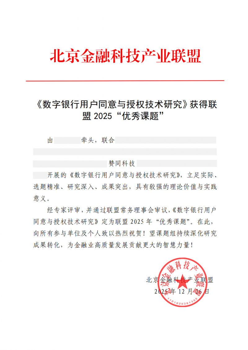 《數字銀行用戶同意與授權技術研究》獲得聯盟2025“優秀課題”