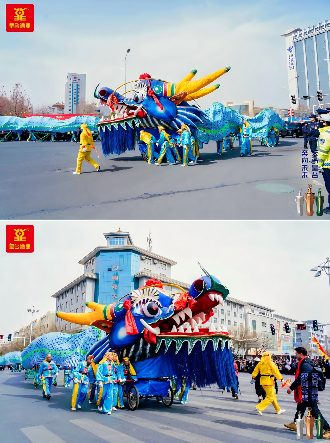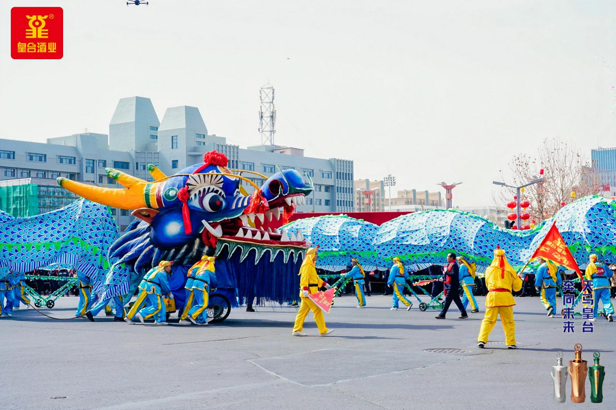 作為壓軸隊伍,皇臺方隊一亮相便點燃現場熱情,成為全場焦點。展演中,最矚目的就是皇臺巨龍,身披湖藍華裳,威風八面,龍身長達99.99米,寓意皇臺之酒,酒海不干。行進間,皇臺巨龍氣勢如虹、頷首擺尾,瓊漿自龍口一路飛灑——醇冽的皇臺酒氣氤氳升騰,彌漫在觀看社火的人山人海間,醉美了整個涼州城,引得歡呼聲、喝彩聲此起彼伏。
