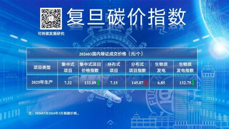 2月28日,復旦大學可持續發展研究中心(以下簡稱“研究中心”)公布了2026年3月復旦碳價指數結果。此次公布了2026年3月全國碳排放配額(簡稱CEA)價格指數、2026年12月全國CEA價格指數、2026年3月全國CCER價格指數以及2026年3月中國綠色電力證書GEC價格指數。