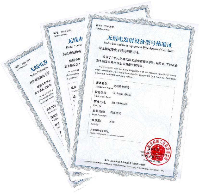 毫米波雷達是智慧交通與車路協同體系中的核心感知終端,而92GHz頻段作為國家專屬規劃的交通路側雷達頻段,能從源頭上解決與車載雷達的頻段干擾問題,是交通新基建領域產品合規入市的硬性要求,更是保障交通感知場景安全、穩定運行的關鍵。此次德冠隆三款核心產品參與的檢測,嚴格遵循工信部《雷達無線電管理規定(試行)》專項標準,對射頻性能、電磁兼容、全場景環境適應性、目標探測精準度、抗干擾能力等核心指標開展全維度、高標準嚴苛測試,三款產品所有檢測項均超額達標,成功取得市場合規運營的“雙證”。