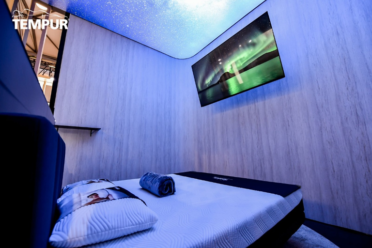 位于主入口正中央的,是本次展出的核心——泰普爾智能睡眠系統(Smart Sleep System)。作為品牌在智能寢具領域的標志性產品,泰普爾智能睡眠系統融合了源自NASA科技的感溫材質與前沿數字技術,構建起從入睡到深睡的全鏈路智能睡眠生態。它并非單一產品,而是由智能床、智慧床墊、智睡枕“三位一體”組成的整體解決方案,能夠通過無感傳感技術實時監測心率、呼吸、體動等生理數據,生成個性化睡眠報告,并在必要時自動進行干預——例如在檢測到打鼾時輕柔調整睡姿,或在淺睡期通過微震動引導放松。現場觀眾將有機會親身體驗智能睡眠系統的核心功能:通過沉浸式助眠模式,床體以舒緩律動配合聲波震動,幫助身心快速放松,打造真正智能化的睡眠場景。