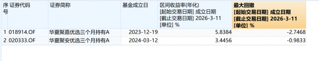 ? 華夏聚安優選三個月持有A(FOF):自2024年3月12日成立至今的年化收益率為3.45%,期間最大回撤為-0.98%。