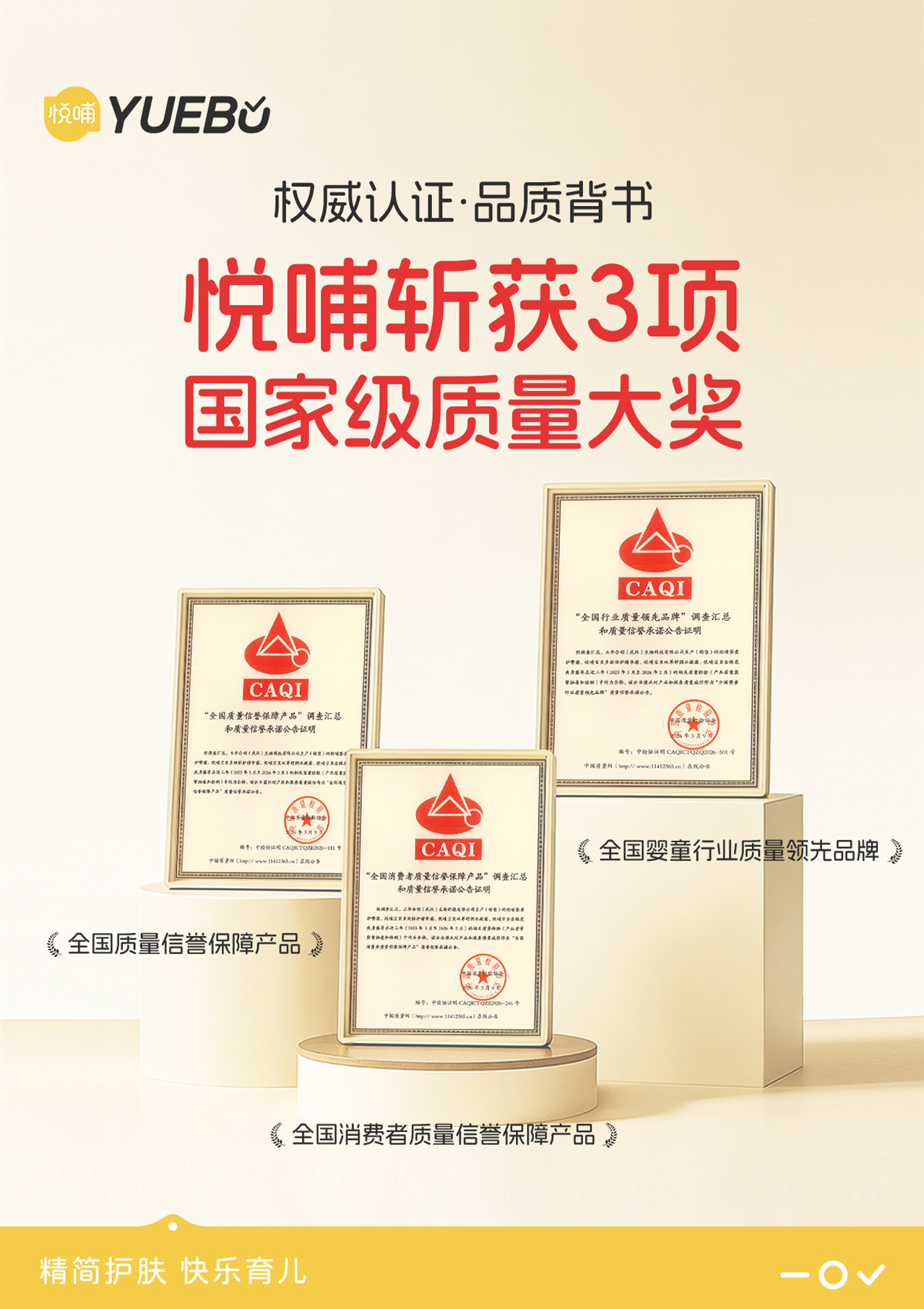 在剛剛過去的2026年3·15國際消費者權益日期間,嬰童護膚品牌悅哺憑借產品品質與誠信經營理念,經相關審核與評定,榮獲中國質量檢驗協會頒發的三項重量級榮譽:“全國嬰童行業質量領先品牌”、“全國消費者質量信譽保障產品”及“全國質量信譽保障產品”。這不僅標志著悅哺在嬰童護膚領域的質量基石獲得行業層面的高度認可,更彰顯了其積極響應中國質量檢驗協會“產品和服務質量誠信承諾”主題活動、主動承擔質量主體責任的品牌擔當。