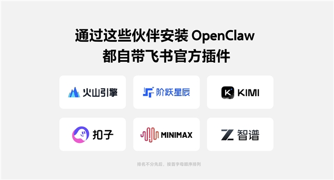 面向工程師,飛書開源并持續升級官方 OpenClaw 插件。該插件支持 OpenClaw 以用戶身份操作云文檔、多維表格及日程,實現與飛書工作流的深度融合。目前,火山引擎、階躍星辰、Kimi、扣子、MiniMax、智譜等主流大模型與云服務廠商均已完成與飛書官方插件的對接。