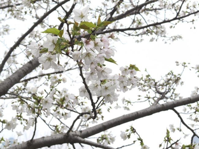 不同于龜山粉櫻的熱烈,西北湖的白櫻更顯清雅。抬眼望去,滿樹繁花如云似雪,素凈的花瓣在陰天里泛著溫潤的光,與身后的玻璃幕墻高樓形成奇妙的碰撞。古老的櫻花與現代的都市,自然的詩意與城市的煙火,在這一刻完美交融。女兒牽著我的手,在花樹下蹦跳著追逐飄落的花瓣,細碎的白瓣落在她的發梢,像撒了一把星光;父母則慢慢踱著步,對著滿樹繁花輕聲贊嘆,眼里滿是對春日的眷戀。