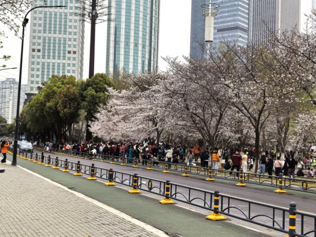 沿著湖岸行走,櫻花大道的盛景愈發震撼。成排的櫻樹并肩而立,枝椏交錯間織成一條白色花廊,游人穿梭其間,仿佛走進了一幅流動的春日畫卷。盡管是陰天,卻絲毫沒有沖淡人們的熱情:攝影愛好者架起長槍短炮,只為捕捉花瓣飄落的瞬間;穿著漢服的姑娘們在花下留影,衣袂與櫻瓣共舞;就連路過的外賣小哥,也忍不住停下車,掏出手機拍一張滿樹繁花。有人笑著說:“武漢人的春天,是被櫻花叫醒的,哪怕天陰著,也要赴這場花事之約。”