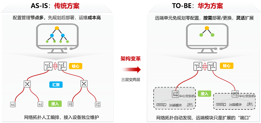 此外,華為獨家極簡架構秉持化繁為簡的思想,創新地將傳統的三層網絡架構簡化為兩層。基于中心交換機對遠端模塊進行統一管理,使客戶無需管理配置接入設備,1秒鐘完成網絡擴展,減少了80%管理節點和77%的工程布線,使客戶綜合建網成本降低了30%以上。配合光電混合纜為客戶提供2000米超遠供電和萬兆極速接入能力,實現本地免取電,保證斷電也不斷網,客戶一次布線未來15年無需翻新,充分保護用戶網絡投資。