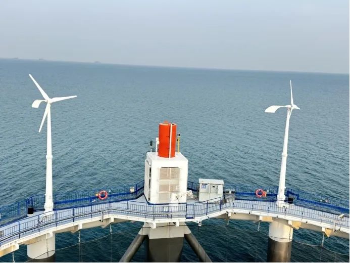 遠處眺望,一條璀璨奪目的“項鏈”鑲嵌于蔚藍大海之上。“項鏈”的一頭是花瓣造型的智慧漁場,另一頭是海星造型的綜合體平臺,由棧橋串聯起“綠色低碳”的海洋牧場運作方式。