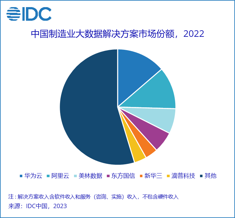 IDC數據顯示,2022年中國制造行業大數據解決方案總市場份額達到21.3億元人民幣,華為云位居第一,阿里云緊隨其后,美林數據、東方國信、新華三、滴普科技分列第三到第六。