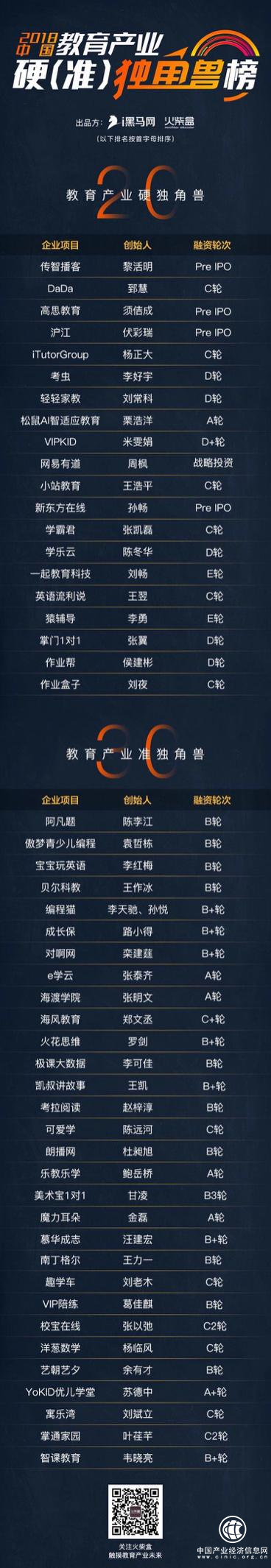 據分析,本次入榜的50家獨角獸中,融資輪次以B輪和C輪為主,共31家,占總數的62%。這50家教育企業大多誕生于2013年至2015年,其中,從事“k12輔導”和“英語等語言培訓”兩個領域的共有27家,占榜單總數的54%。另外值得關注的是,本次有10家素質教育企業擠進準獨角獸行列,占榜單總數的20%。